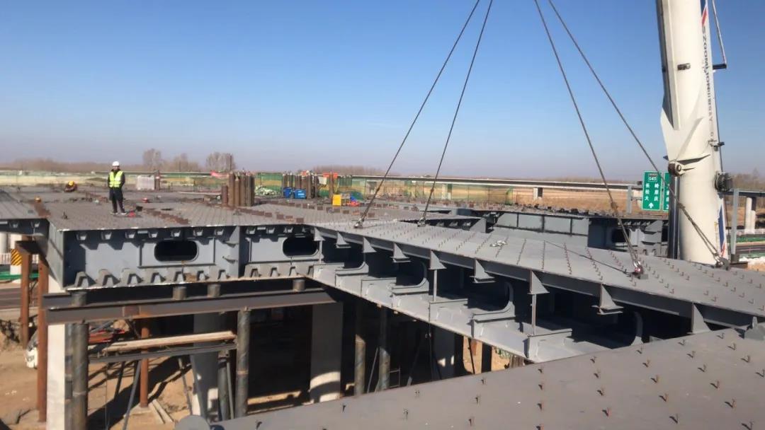 2018年10月,該項(xiàng)目順利完成了鋼箱梁首吊工作,其中敖卜互通均橫跨長深高速,協(xié)力互通XC匝道橫跨大廣高速,施工過程中既需保證高速半幅通車,還需保證過往車輛、施工人員的安全,施工難度極大,同時(shí)各聯(lián)段按照既定計(jì)劃實(shí)施存在較多變數(shù),工期保證難度極大。為保證項(xiàng)目順利完成,在海波重科現(xiàn)場負(fù)責(zé)人胡劍濤帶領(lǐng)下,克服種種困難,與甲方密切配合,制定合理的、切實(shí)可行的聯(lián)段安裝計(jì)劃和可行的交通疏導(dǎo)方案,以保證長深高速、大廣高速車流順暢,同時(shí)做好安全防護(hù)工作;合理安排梁段安裝順序,選擇最優(yōu)的吊車占位地點(diǎn),提高安全性、減小安裝難度。